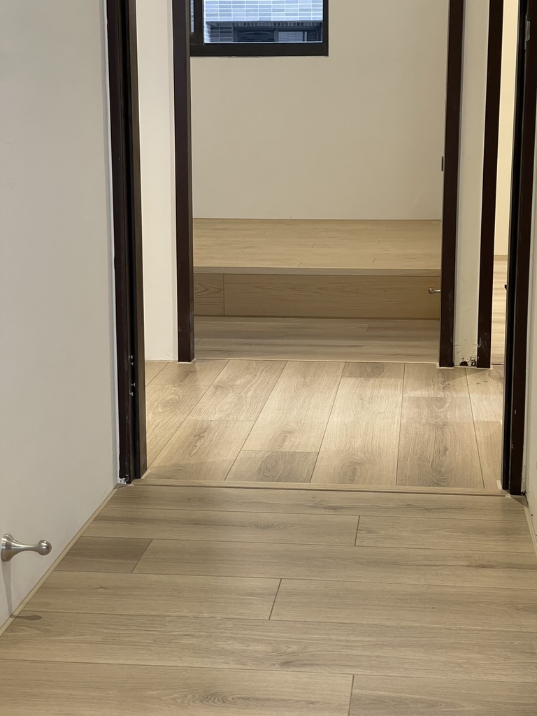 木地板從客廳延續出去到各個房間,讓原本狹窄的走廊看起來寬敞許多。銜接處收得很平整,踩起來幾乎沒有高低差。
