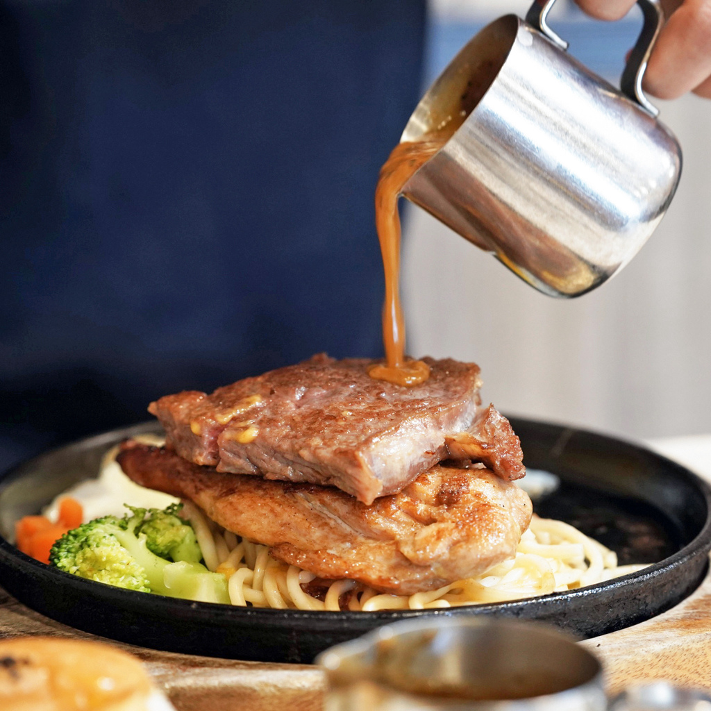 這次我點了沙朗牛排+五香雞排的雙拼,剛上桌就香氣四溢,光看就讓人食指大動。如果不想吃麵,還可以換成蛋,份量真的超夠,食量小的朋友可能要考慮一下XD